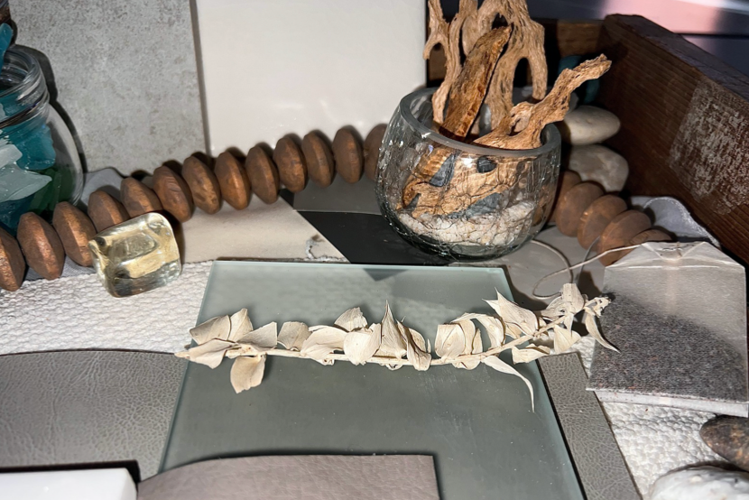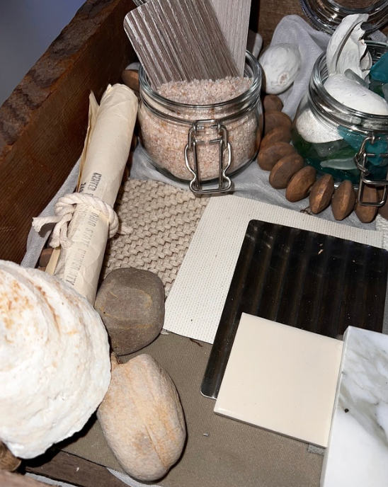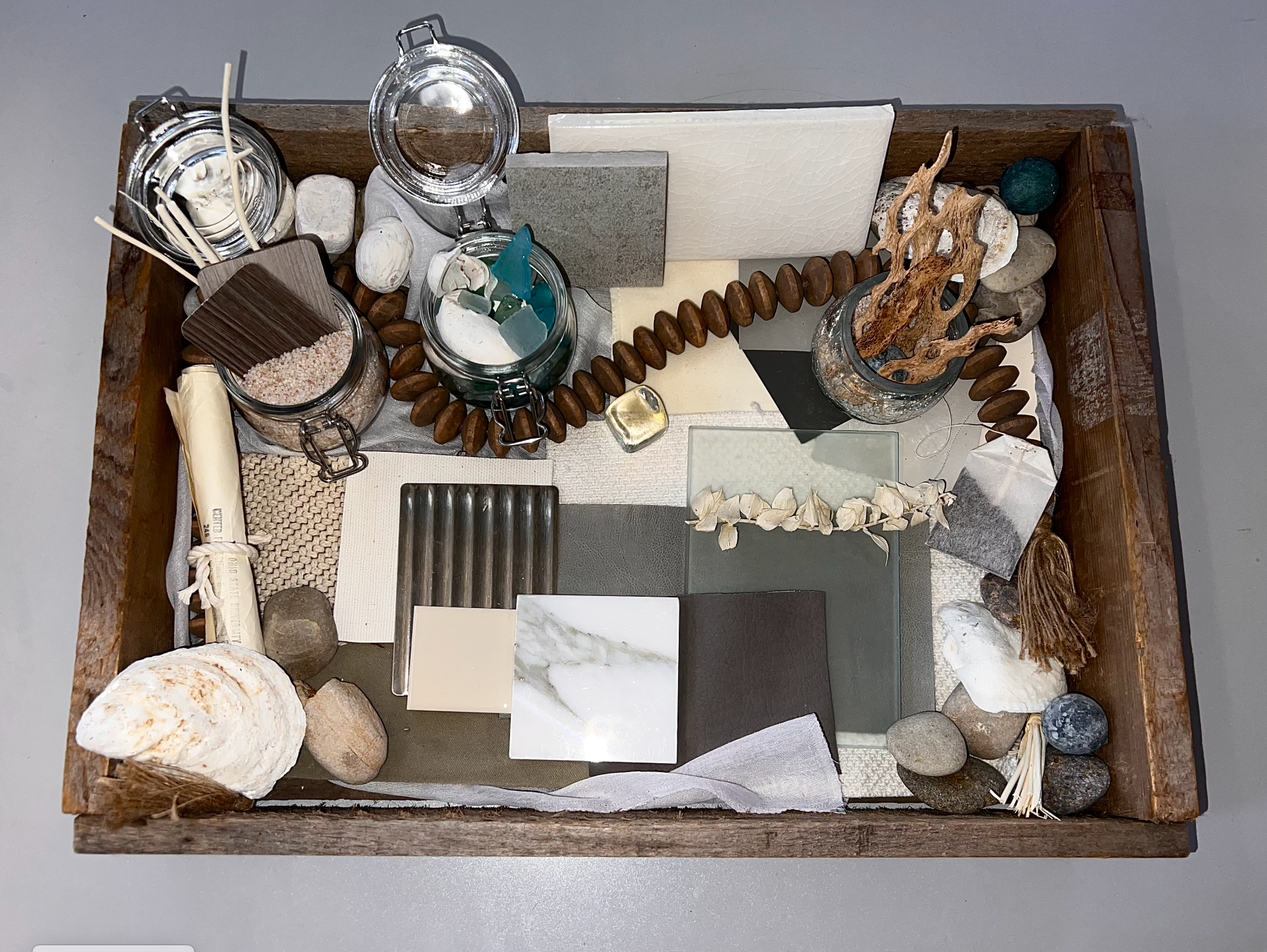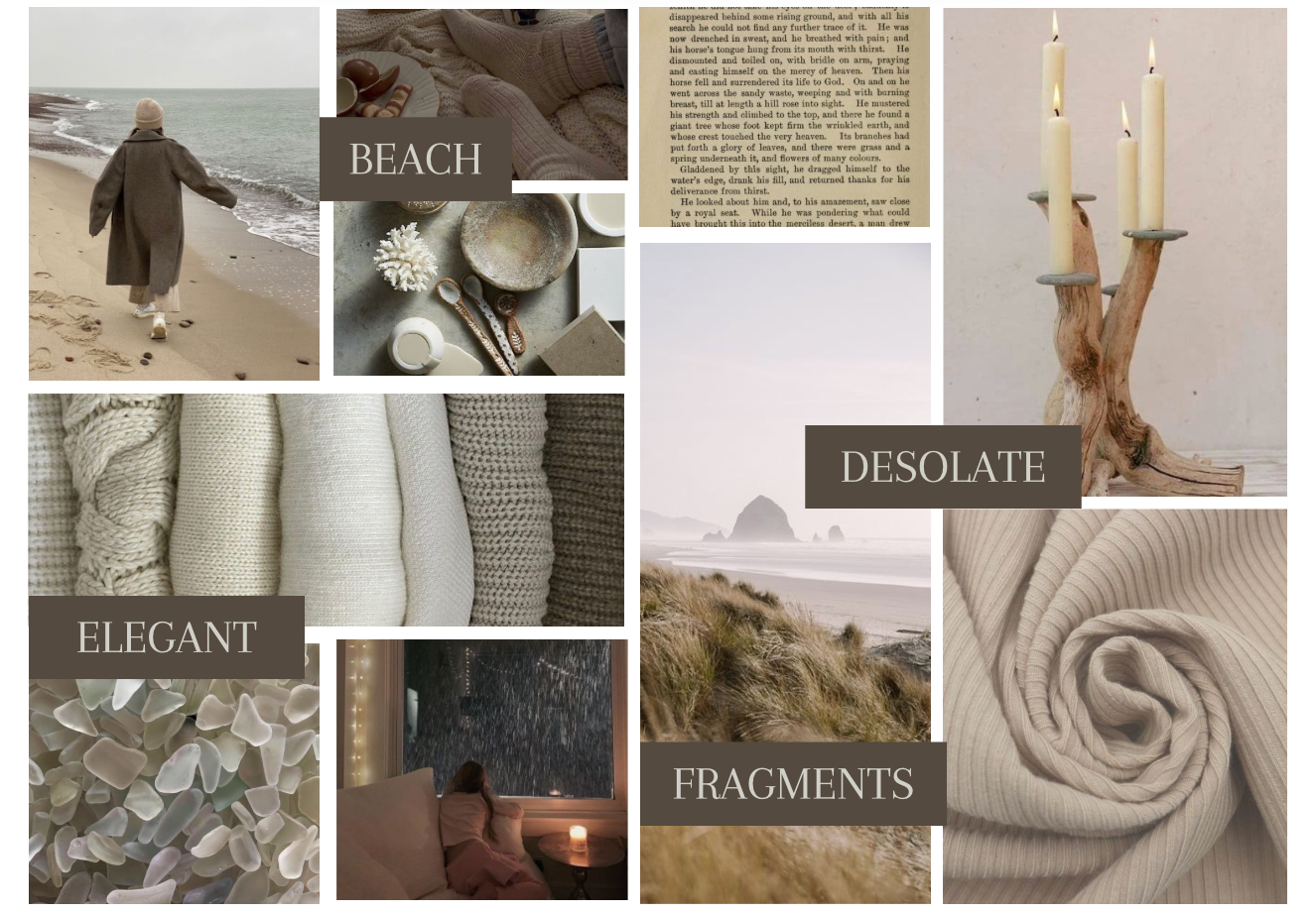The overall goal was to find a contrast between rich, intentional materials and deserted beach fragments. I chose to incorporate a light colored, unfinished cement block to look like it's been worn by the environment. Then, I used a more dull sheet of ribbed metal as well as a piece of frosted glass to add some extra hardness to the palette and to evoke a cold, foggy feeling. My choices of upholstery to show the coziness of a winter beach day included both a taupe and cream velvet, a tan knit carpet sample, and some white woven polyester. A white sheer fabric was used to create the effect of a light breeze.