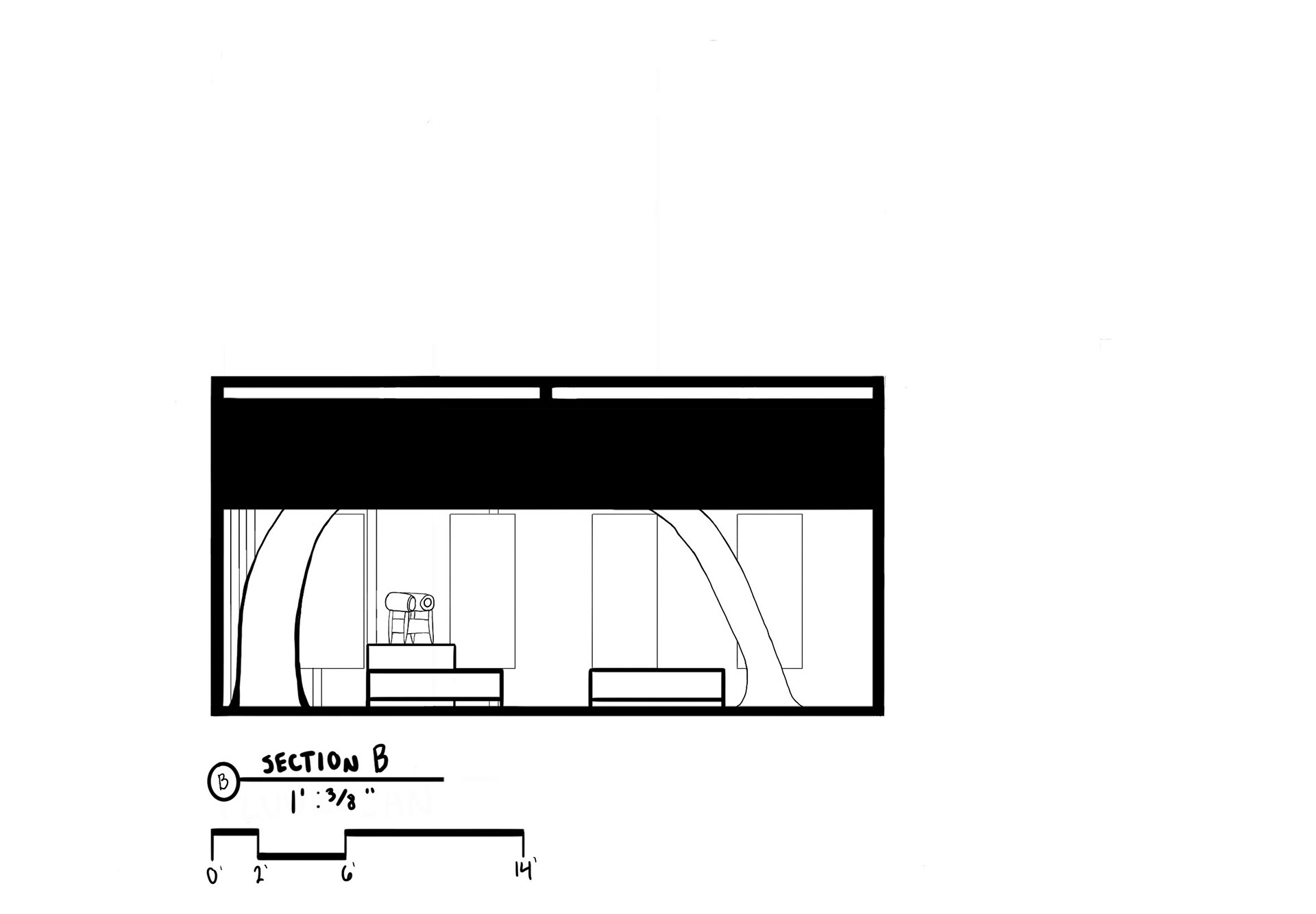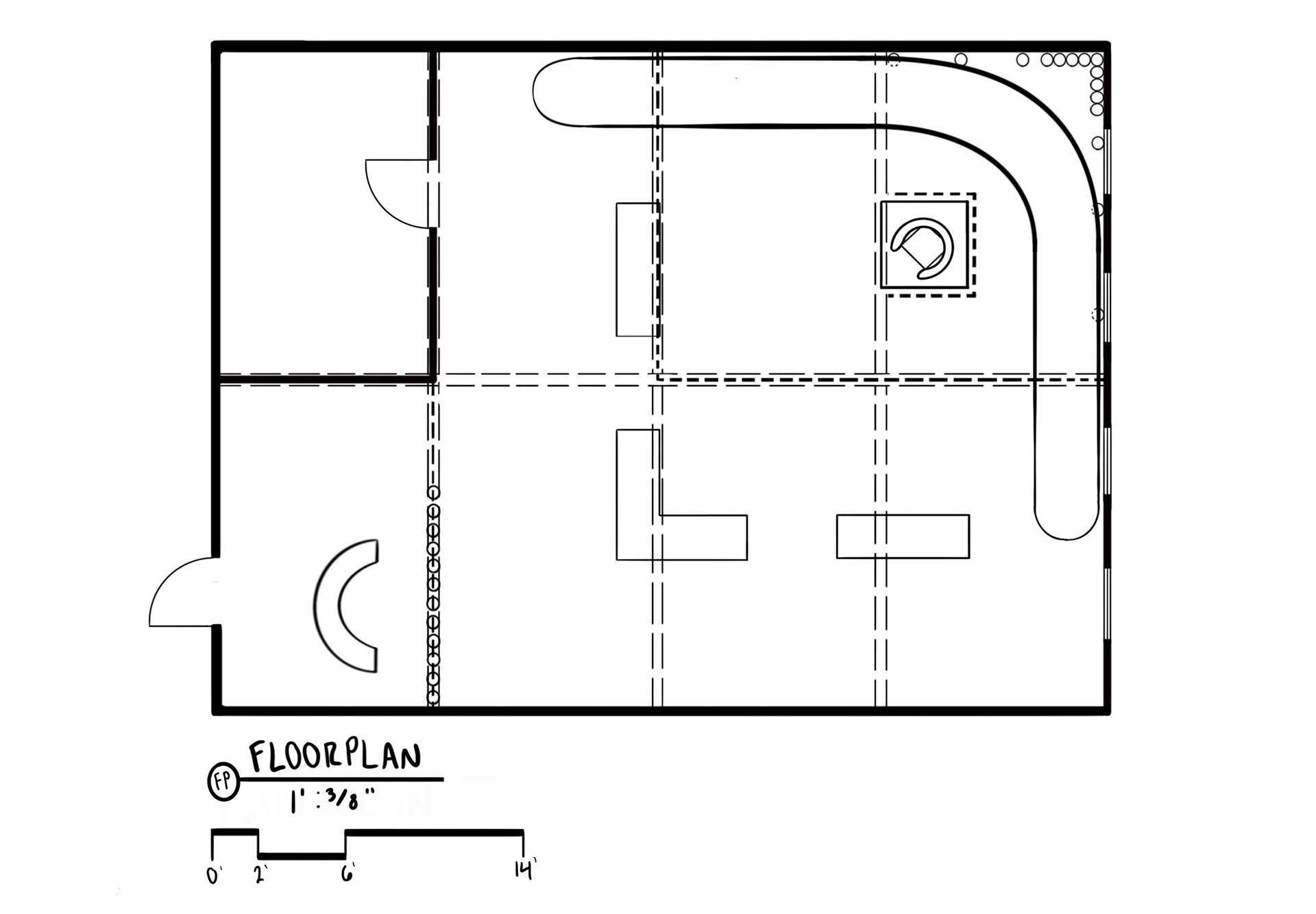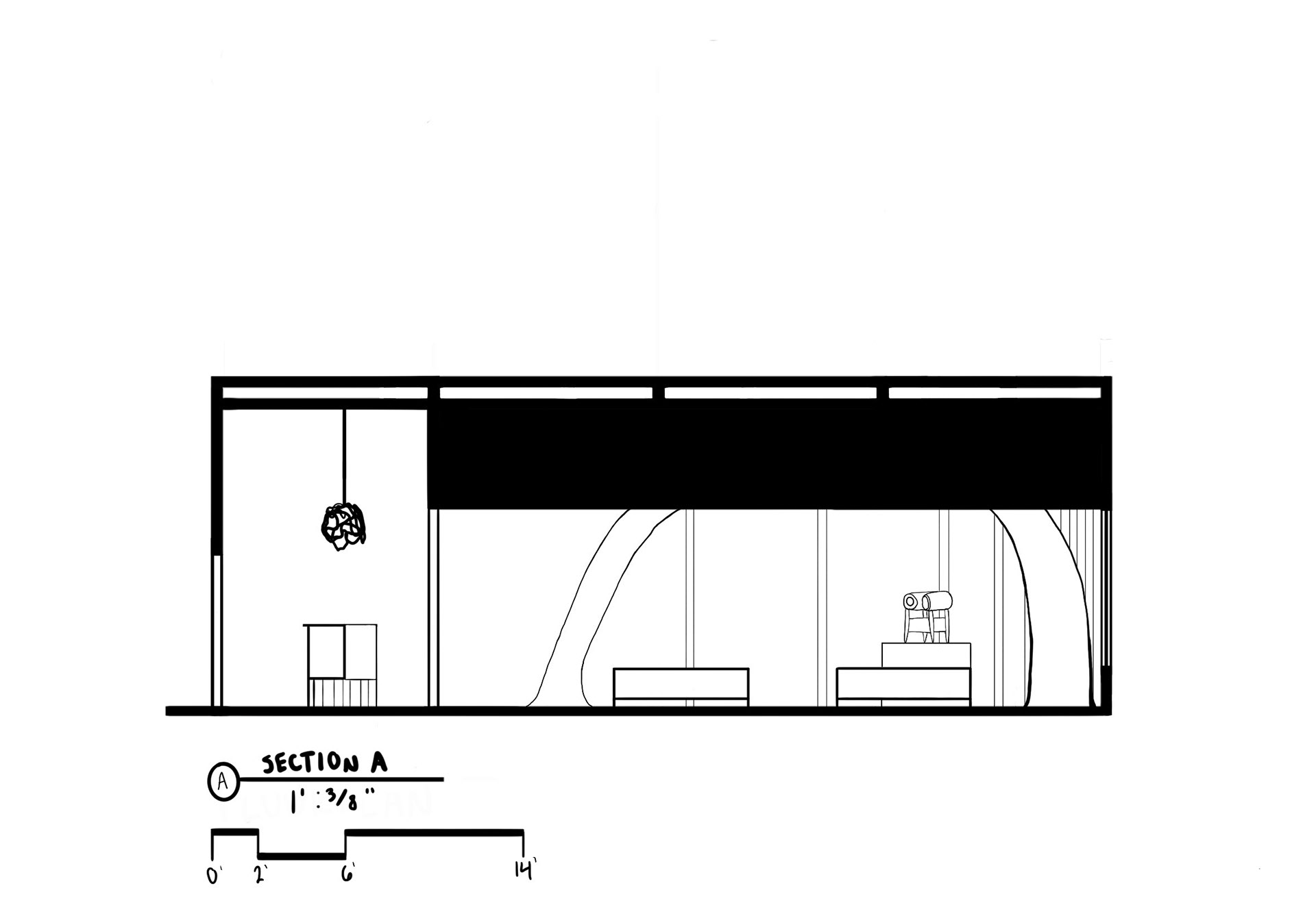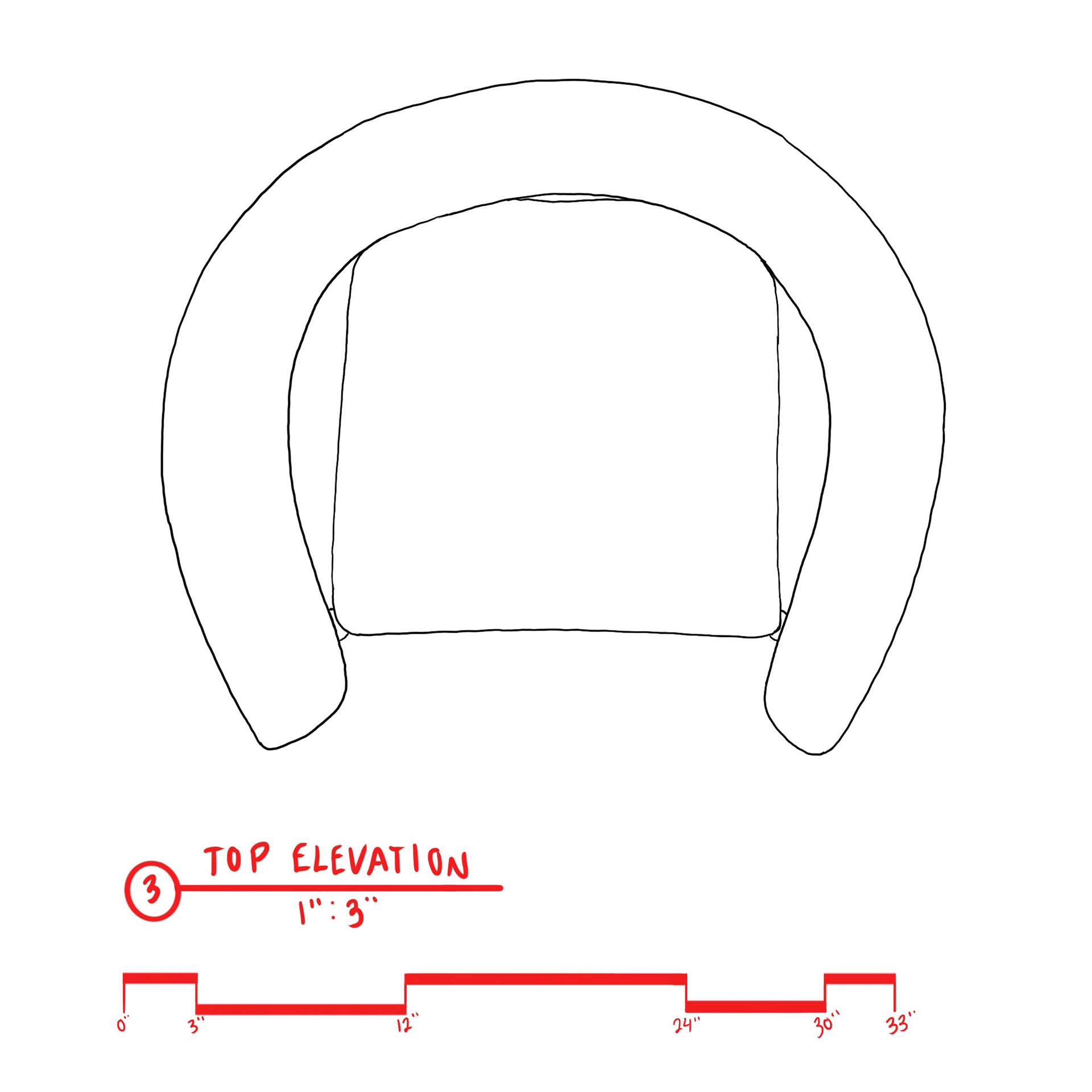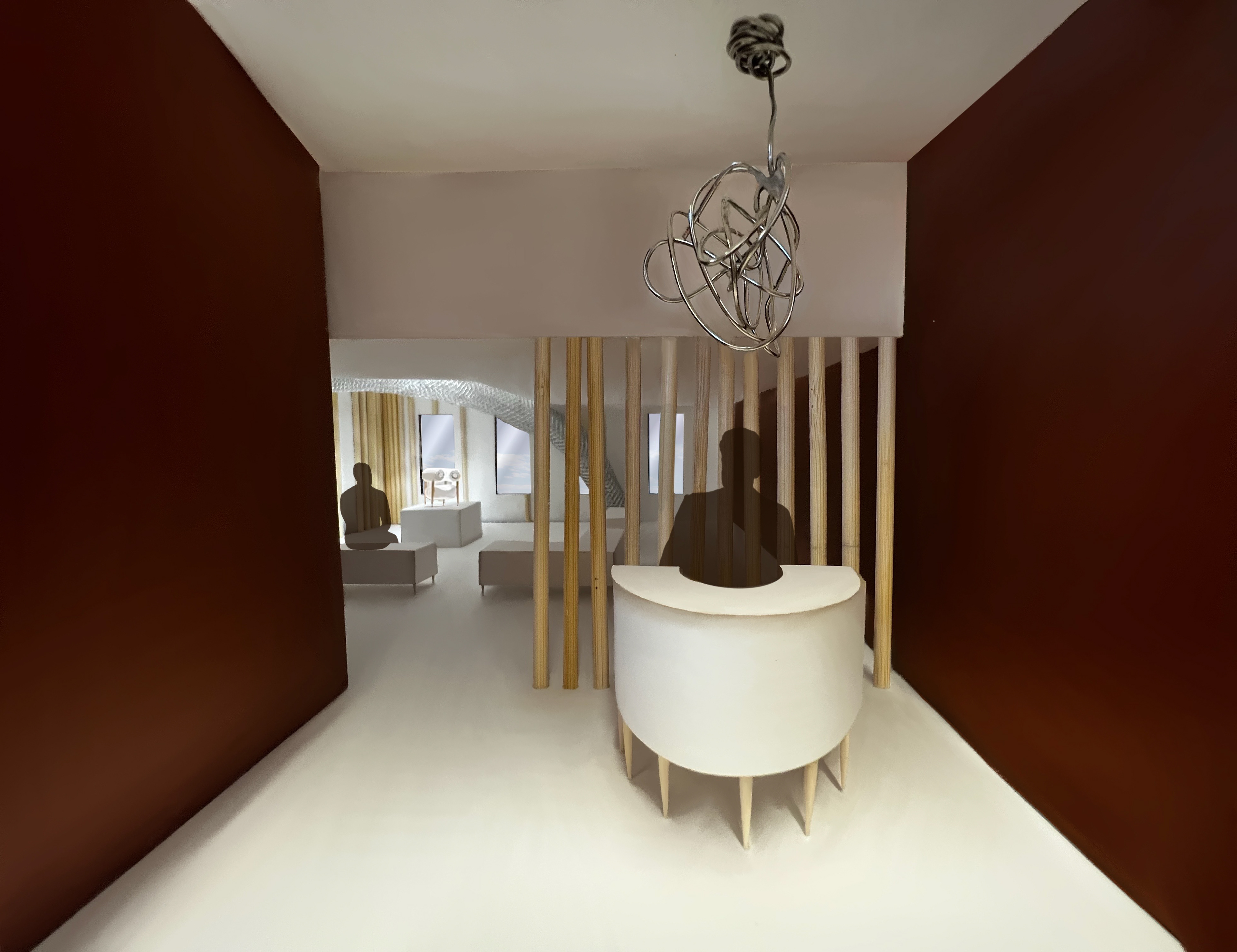 The most significant element in my space is framed views. I used drop ceilings to emphasize two areas where the ceilings rise higher, naturally framing key focal points. The most striking feature is a mesh arch that spans the back corner of the gathering space, symbolizing the welcoming embrace of the Ring Chair’s curved back. This arch is designed to envelop visitors, mirroring the chair’s inviting form.