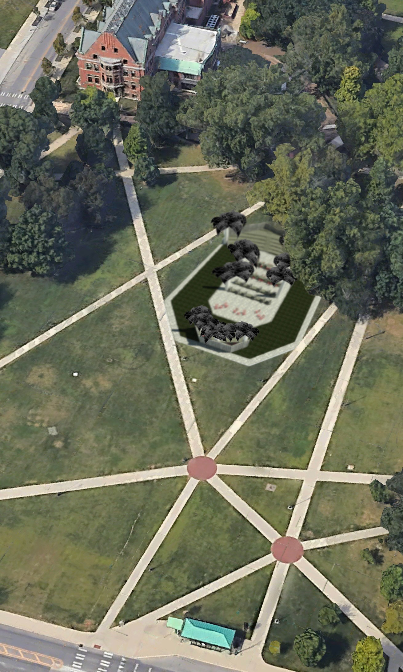 Each of us focused on creating an insertion to support our pillars of sustainability, mine being Insertion #4, an outdoor solar panel seating area. This insertion can be found at the bottom of the page below my group members. The Block O shaped grove is located on the eastern section of the South Oval, incorporating buckeye leaf solar trees providing energy to power banks throughout the grove. It includes nine solar trees, amphitheater seating, an amphitheater stage, and four 32' long built-in, biophilic seating areas. The space allows visitors to connect with the university while also connecting with the planet.
