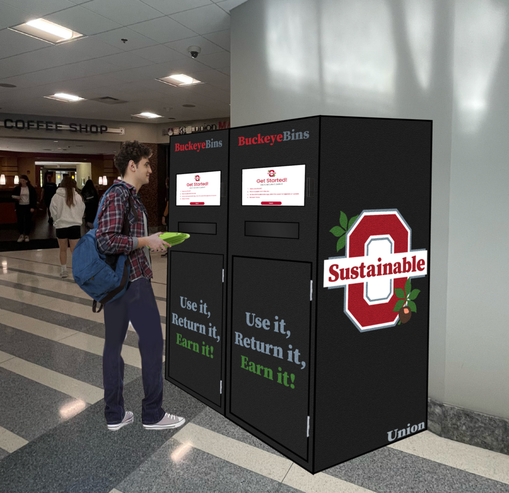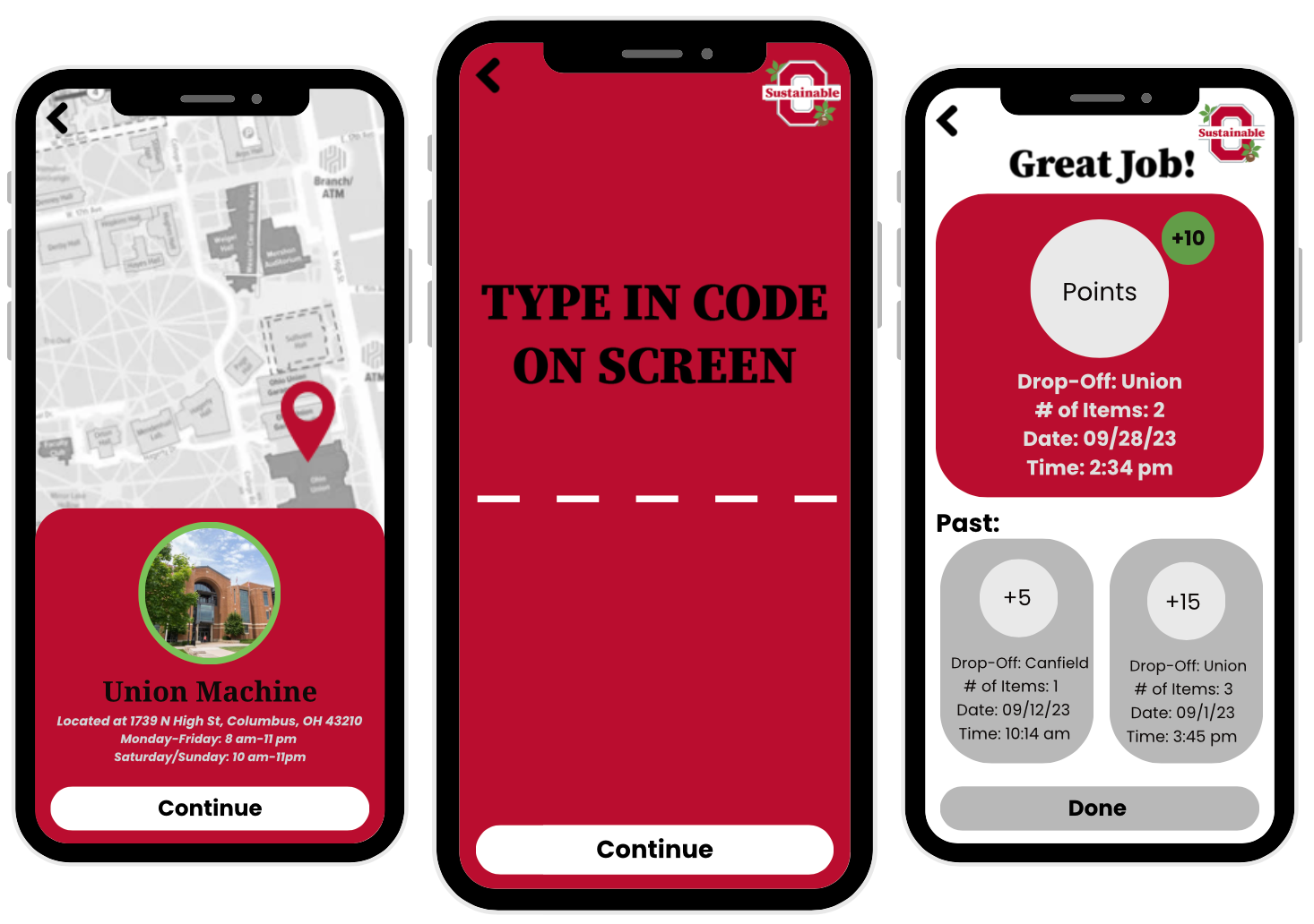 This section of the app is to be used when returning reusable containers from the dining hall to any “Buckeye Bin” machine around campus. When a bin is returned to the machine, a code will appear and this will be typed in on the app in order to gain points and receive rewards. This encourages students to reduce waste and be rewarded by their sustainable action.