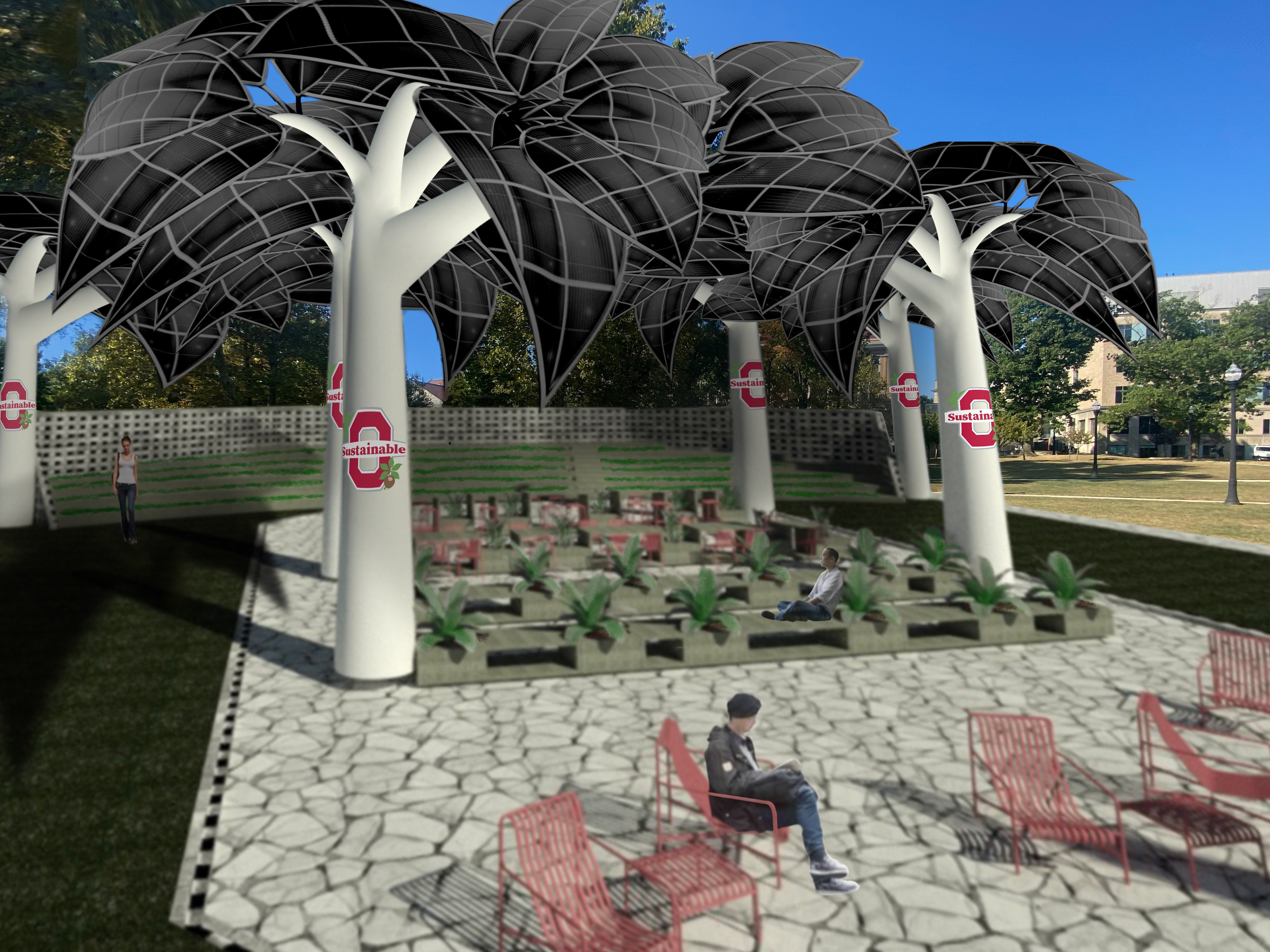 The Block O shaped grove is located on the eastern section of the South Oval, incorporating buckeye leaf solar trees providing energy to power banks throughout the grove. It includes nine solar trees, amphitheater seating, an amphitheater stage, and four 32' long built-in, biophilic seating areas. The space allows visitors to connect with the university while also connecting with the planet.