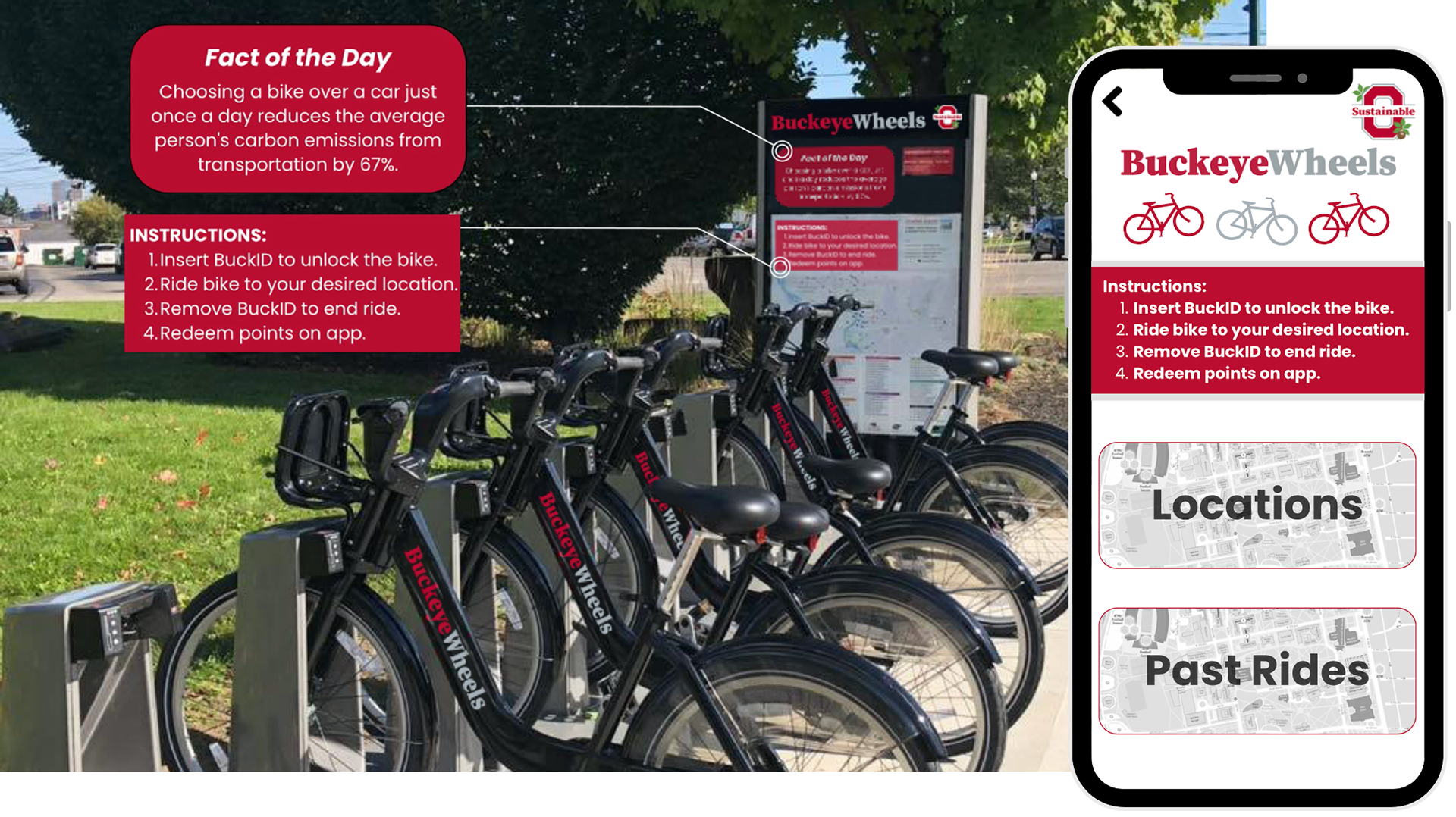 The ”Buckeye Wheels” section of the app allows for students to track their bike ride and miles. When a ride is complete, the bike logs their miles and they redeem points for a reward. It encourages students to ride bikes to their location rather than driving a car.
