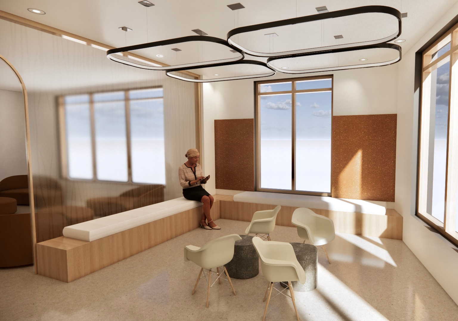 The space that I designed was the Wellness Center waiting room. Taking inspiration from existing Wexner facilities, I chose clean, modern design elements and subtle Ohio State branding. The chosen materials are CFFA certified and bleach cleanable for the health and safety of the patients.