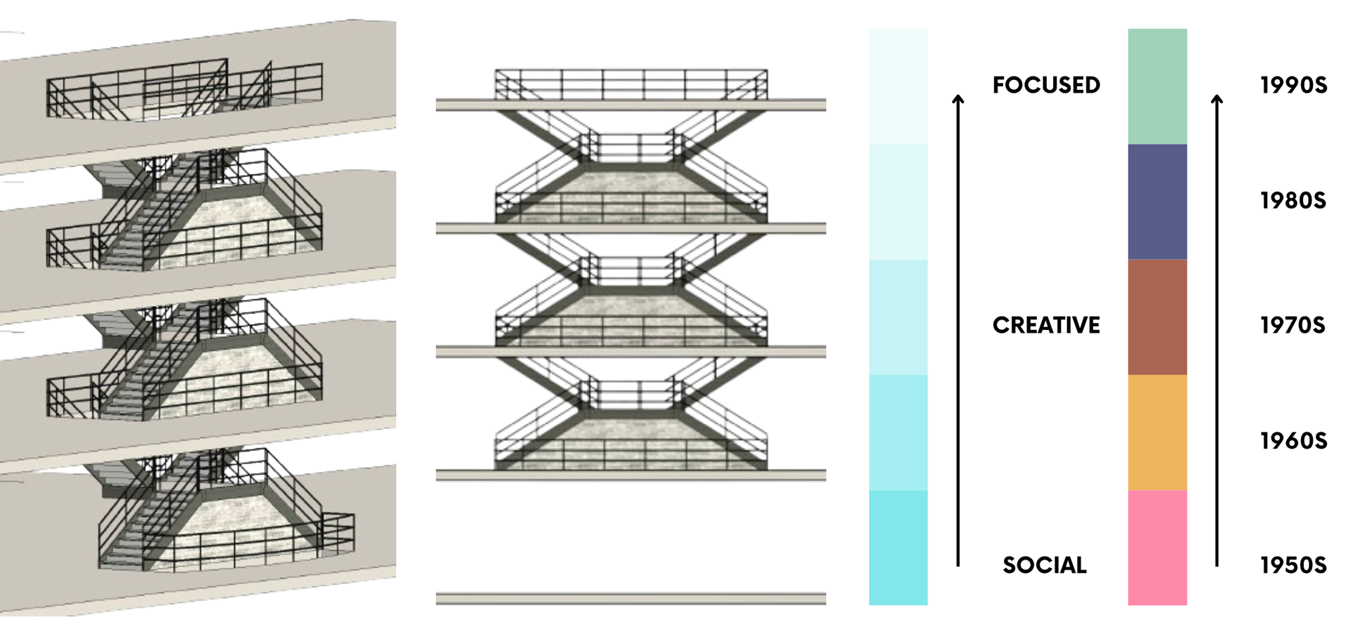 Each visitor is able to flow upwards through the center staircases of the space, following their individual journey through the decades. As the levels go up, decades progress and the spaces become more focused.